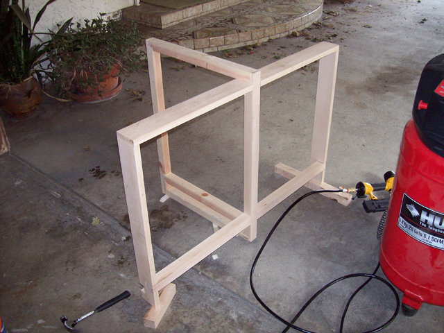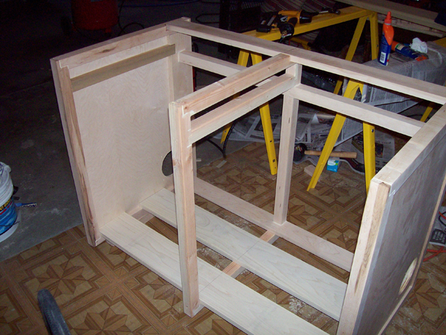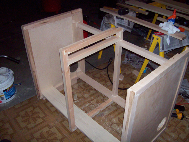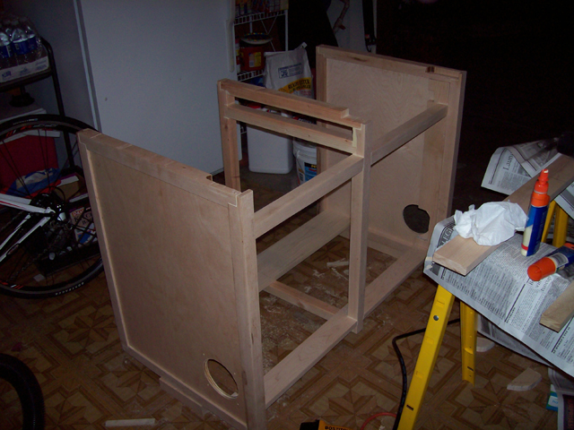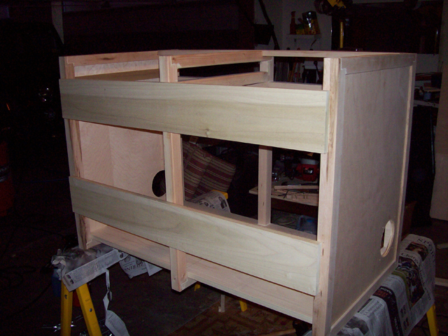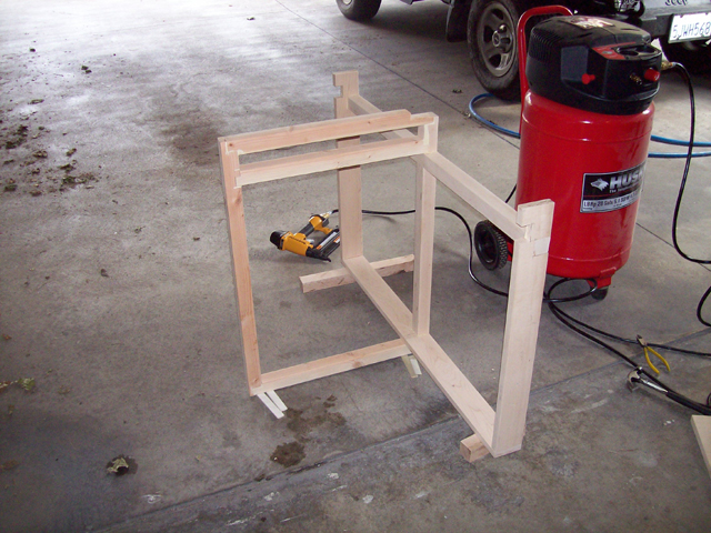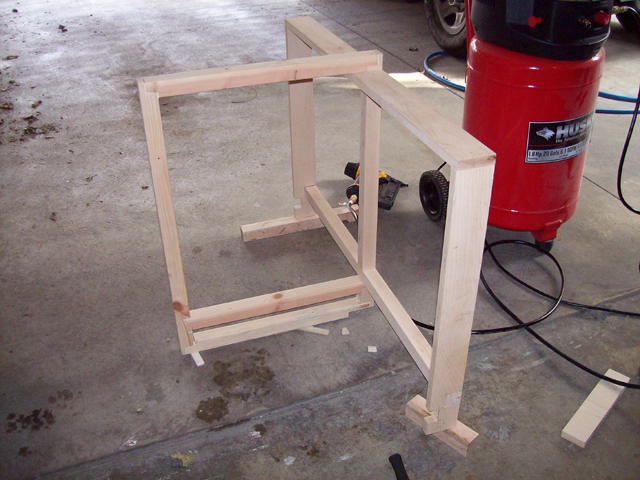 Front view of the assembled body with the sides and the front cross member and bottom planks installed.