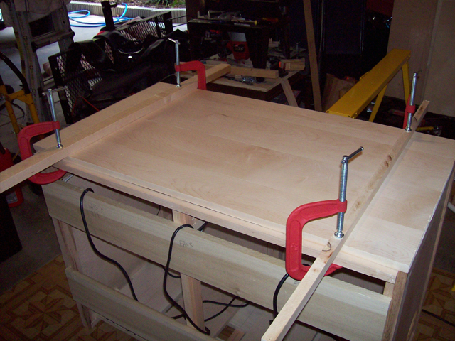 After mounting the top, I found that the braces added to the top to flatten it and used to mount it interfered with the drawers.