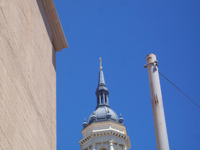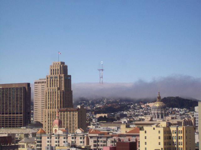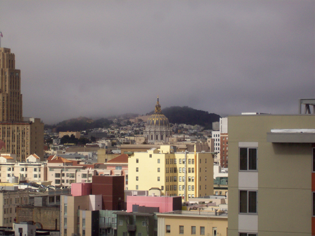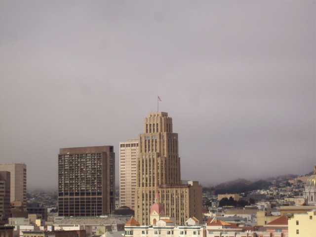 HT3091 - San Francisco City Hall Steeple, as viewed from our hotel room. The mark is the tip of the steeple