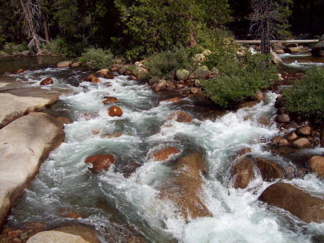 View upstream of the Merced River from the bridge crossing above Nevada Fall.